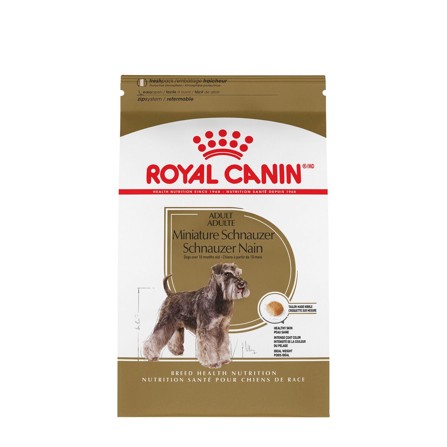 Schnauzers are well-known for their distinctive coats and high energy. With targeted nutrients, MINIATURE SCHNAUZER ADULT controls fat intake and promotes a vibrant, healthy skin and coat, while the tailored kibble helps promote oral health.MINIATURE SCHNAUZER ADULT is designed exclusively for purebred Miniature Schnauzers over 10 months.