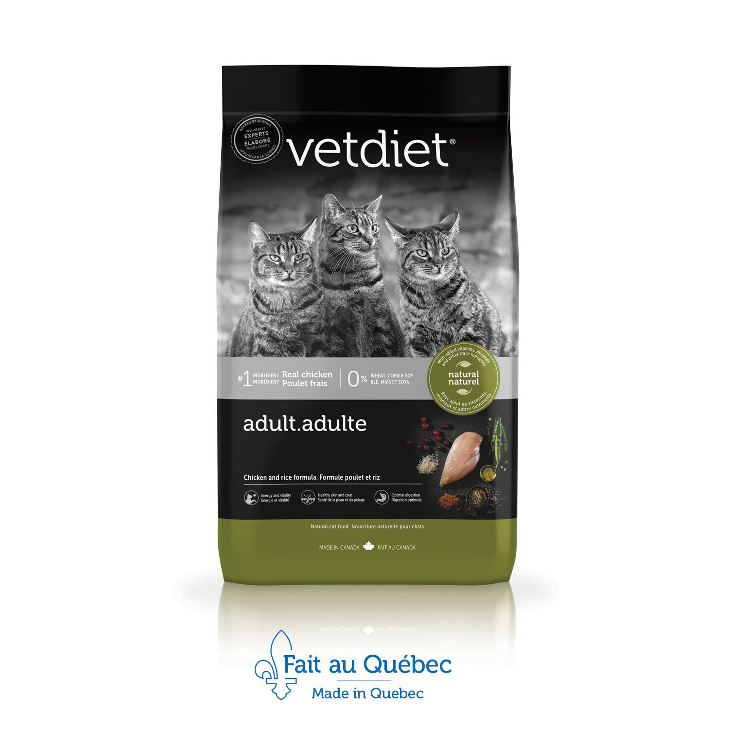 Vetdiet adult cat food is specially formulated with fresh deboned chicken and other natural ingredients to meet your cat’s nutritional needs. It offers an ideal balance of energy and nutrients to help support healthy vitality as well as a blend of prebiotics that contributes to optimal digestion. You will also see a visible difference in your cat’s skin and coat thanks to optimal levels of omega-3 and omega-6 from flaxseed and fish oil
