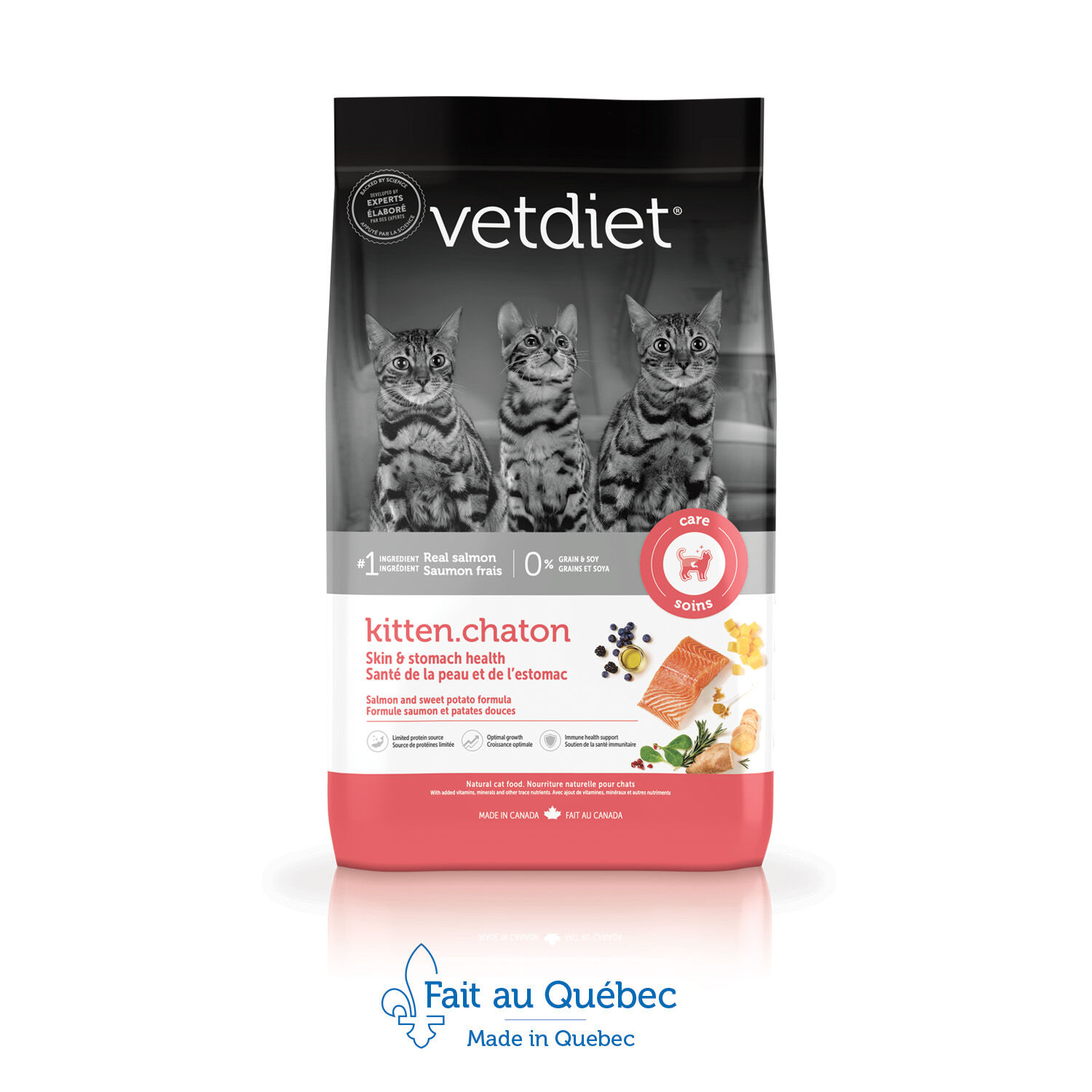 Vetdiet® skin and stomach health kitten food—salmon and sweet potato formula is specially formulated with limited sources of protein from real salmon and salmon meal. This food is designed for kittens with specific needs. We start with real salmon as the first ingredient to help build strong muscles as well as a blend of antioxidants and prebiotics, which helps support a healthy immune system. This food is grain-free, and is formulated with ingredients such as sweet potatoes and peas which are easily digestible sources of carbohydrates.